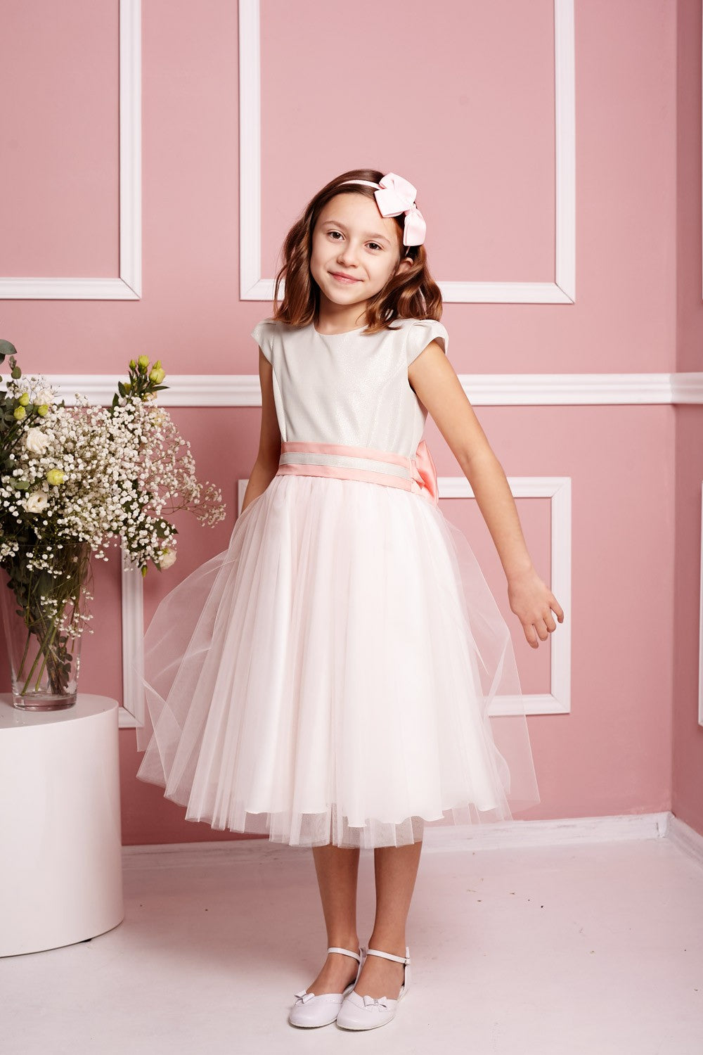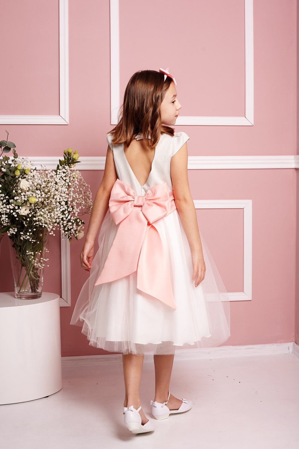Een elegante ceintuur in de taille zorgt ervoor dat de jurk perfect op uw figuur aansluit. De jurk is versierd met een grote strik. De rok bestaat uit drie lagen: tule op satijn en een voering van acetaat, afgewerkt met tule. De lengte valt tot onder de knie. Perfect voor een omkleedbeurt na de communie, bruiloften en andere speciale gelegenheden.