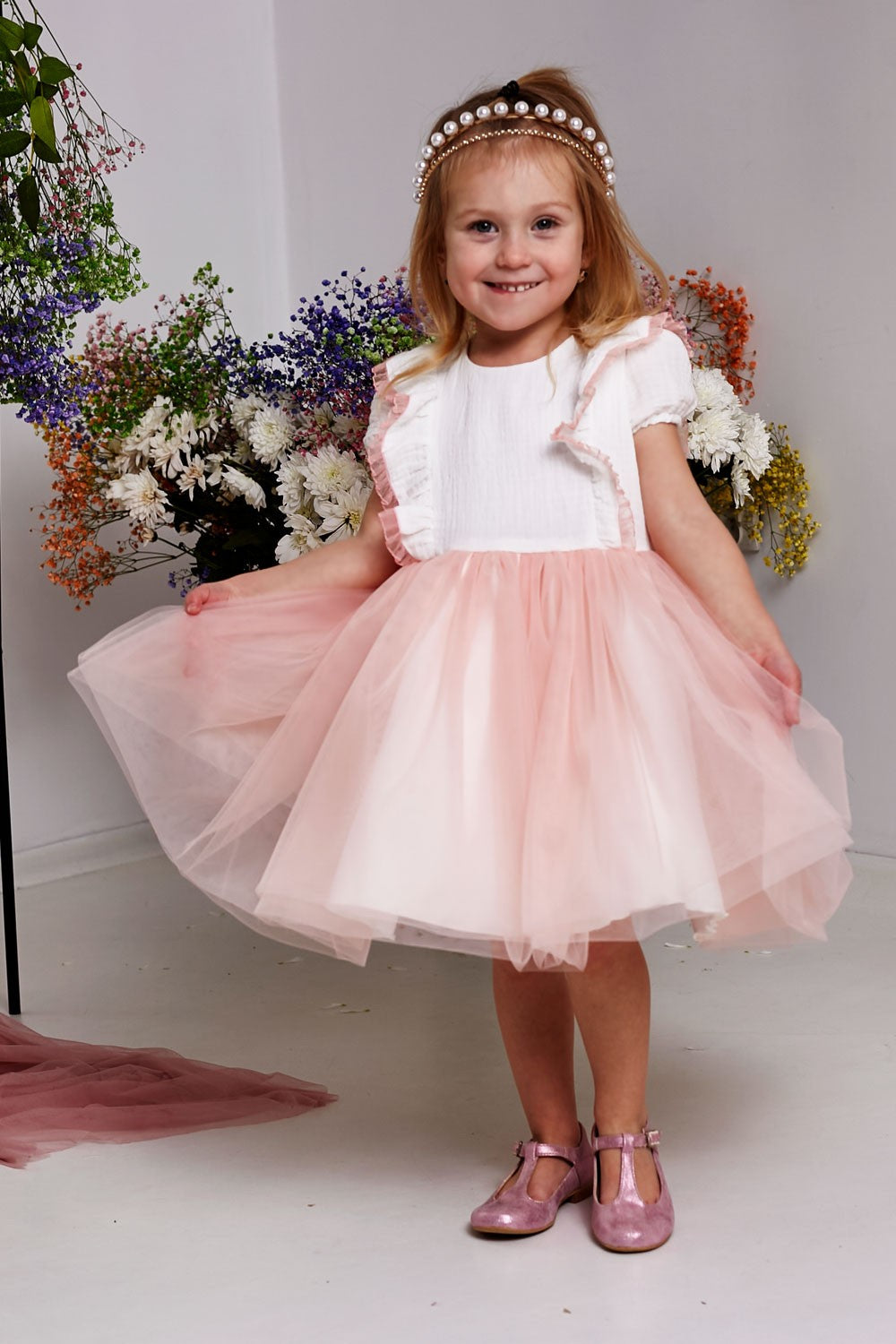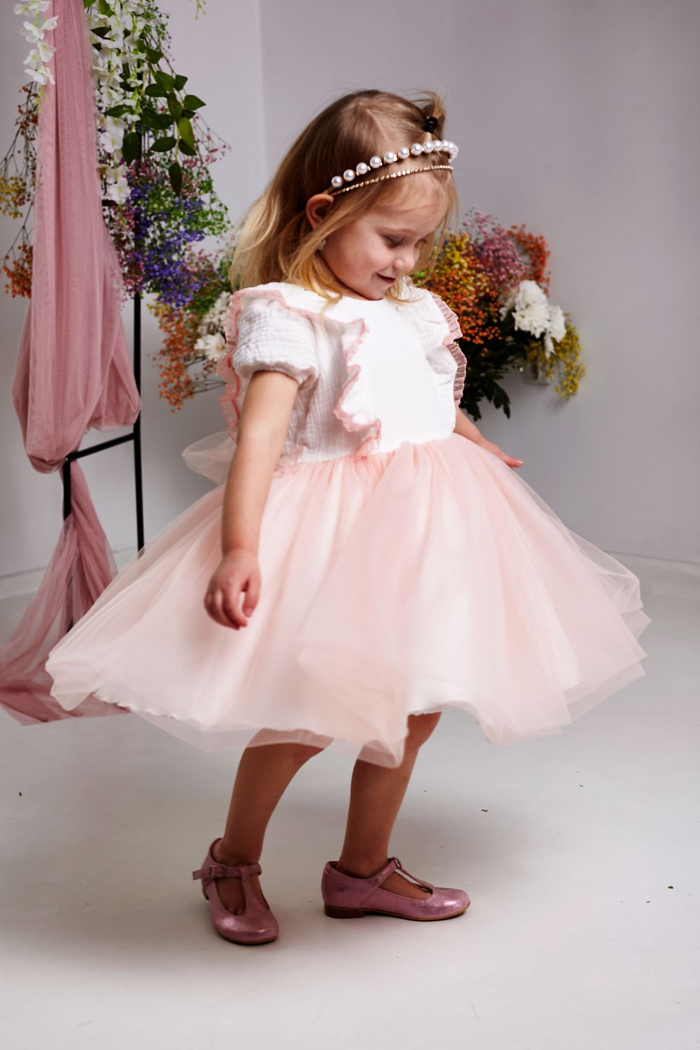 Een unieke jurk voor een elegante gelegenheid. Het bovenstuk is gemaakt van zachte mousseline met een katoenen voering. Het is niet-irriterend en krasvrij, waardoor het ideaal is voor de babyhuid. Het heeft verticale ruches van tule, terwijl het onderste gedeelte bestaat uit twee dubbele lagen zachte tule.