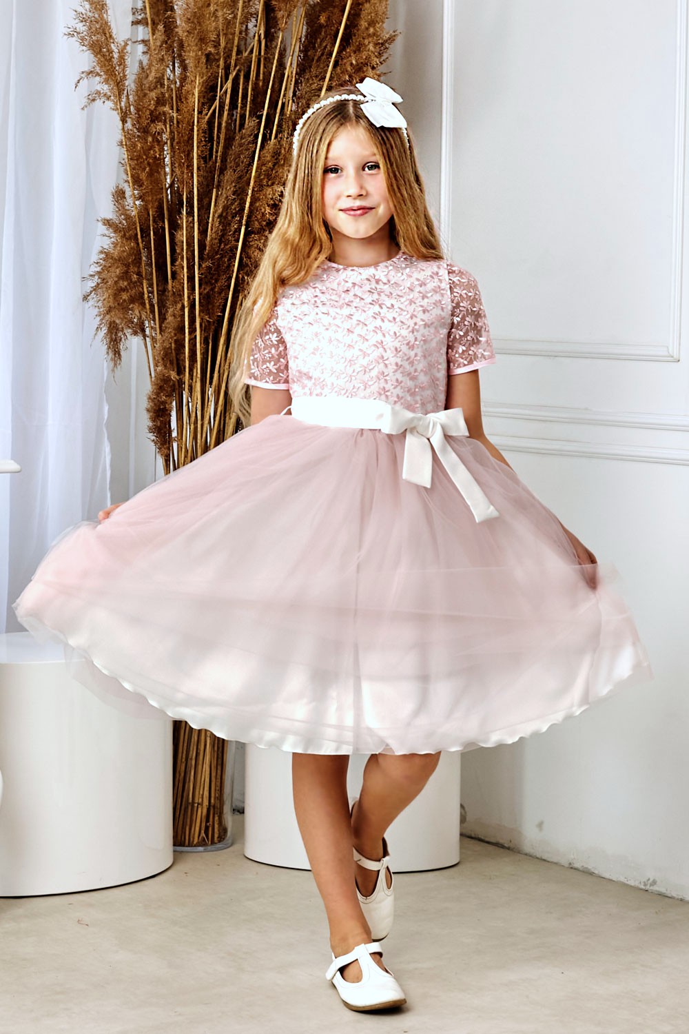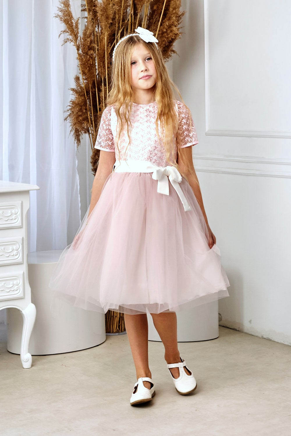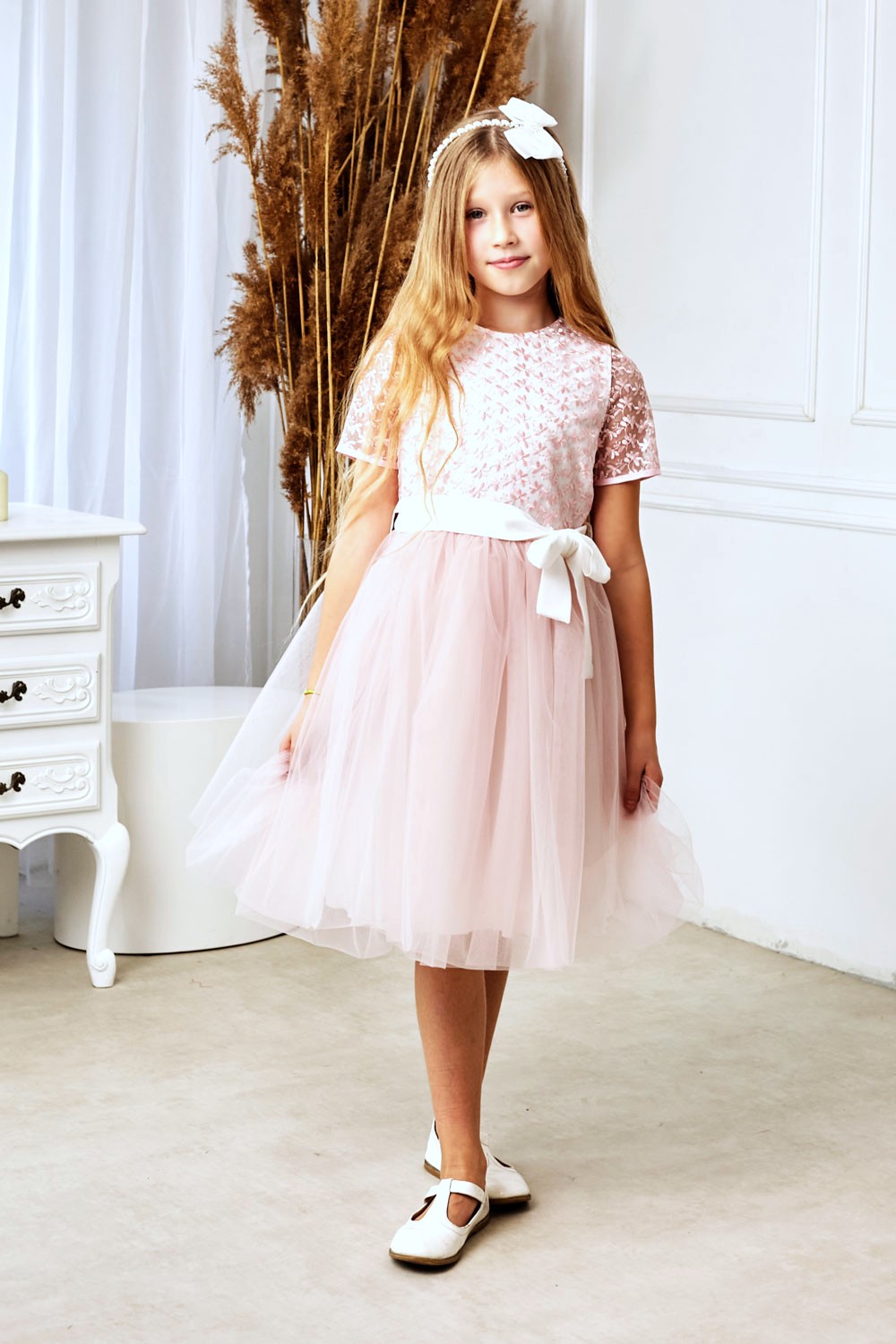 Een prachtige jurk, perfect voor een eerste communie, bruiloft of verjaardag. Het bovenstuk is gemaakt van guipure kant met een roze bloemenpatroon. De taille is voorzien van riemlussen en een ceintuur die aan de voorkant met een strik wordt vastgemaakt. De rok bestaat uit drie lagen: tule op satijn en een katoenen voering, afgewerkt met extra tule. De jurk valt tot onder de knie. Perfect voor een omkleedbeurt na de communie, bruiloften en andere speciale gelegenheden. Samenstelling: